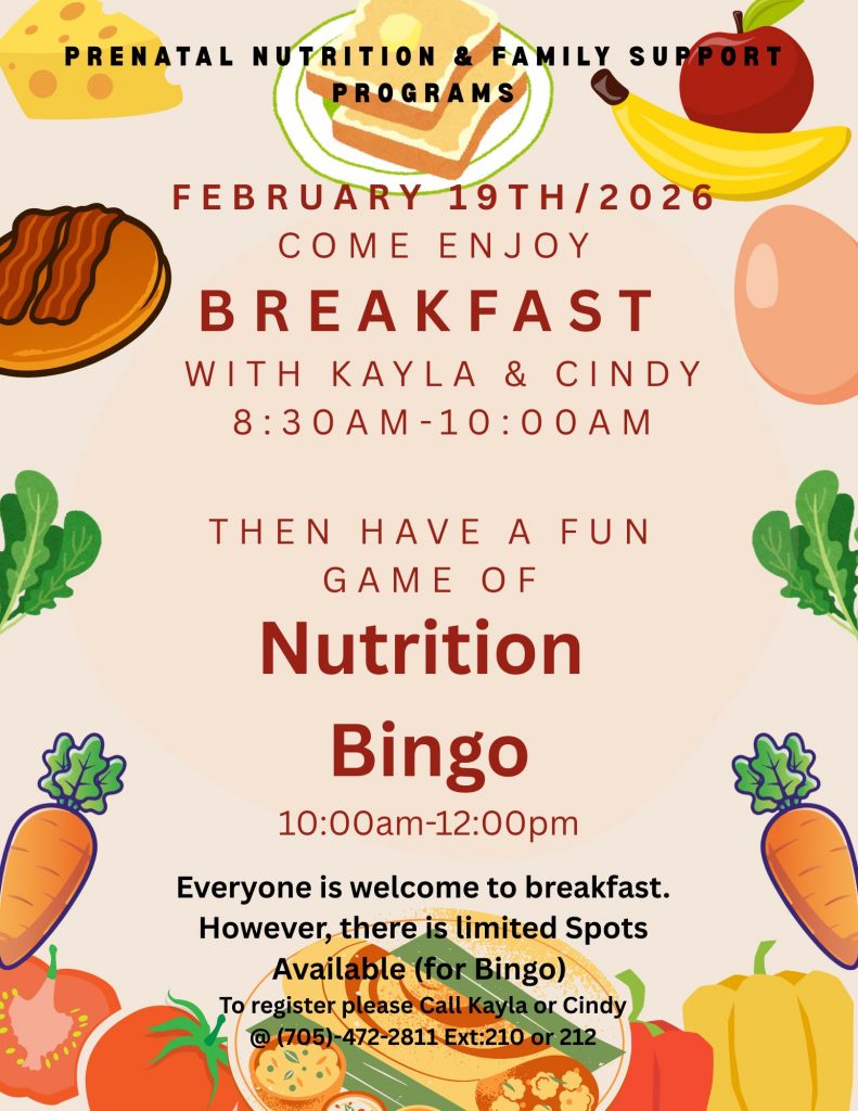 Come and join Family Support and Prenatal Nutrition programs for a breakfast on February 19th 2026! Breakfast will be at 980 Cassells St. at 8:30am to 10:00 am. After breakfast, stick around for some Nutrition Bingo from 10:00am-12:00pm! Bingo has limited spots, to register please call 705-472-2811 ext. 212 or 210