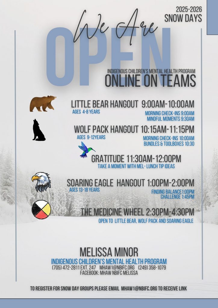 You must register your child to attend with Melissa or Sarah at 705-472-2811 ext. 247 or you can reach them through email at mhaw1@nbifc.org