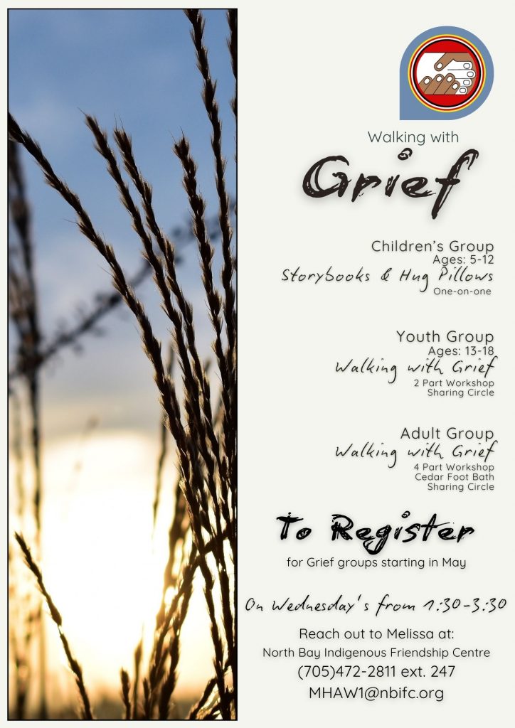 Walking with Grief is starting back up in May. There is a children’s group, a youth group, and adult group. The children’s group is for ages 5-12, it is one to one grief support with storybooks and hug pillows. The youth group is for ages 13-18, which is a two part workshop and sharing circle. The adult group is for ages 18+ and is a four part workshop with cedar footbaths and sharing circle.