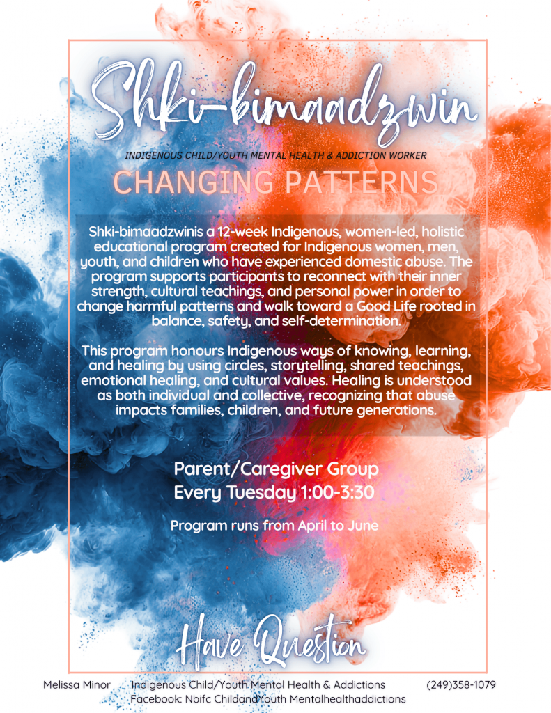 Shki-bimaadzwin is a 12 week Indigenous, women-led, holistic educational program creates for Indigenous women, men, youth, and children who have experienced domestic abuse. The program supports participants to reconnect with their inner strength, cultural teachings, and personal power in order to change harmful patterns and walk towards a good life rooted in balance, safety, and self determination.