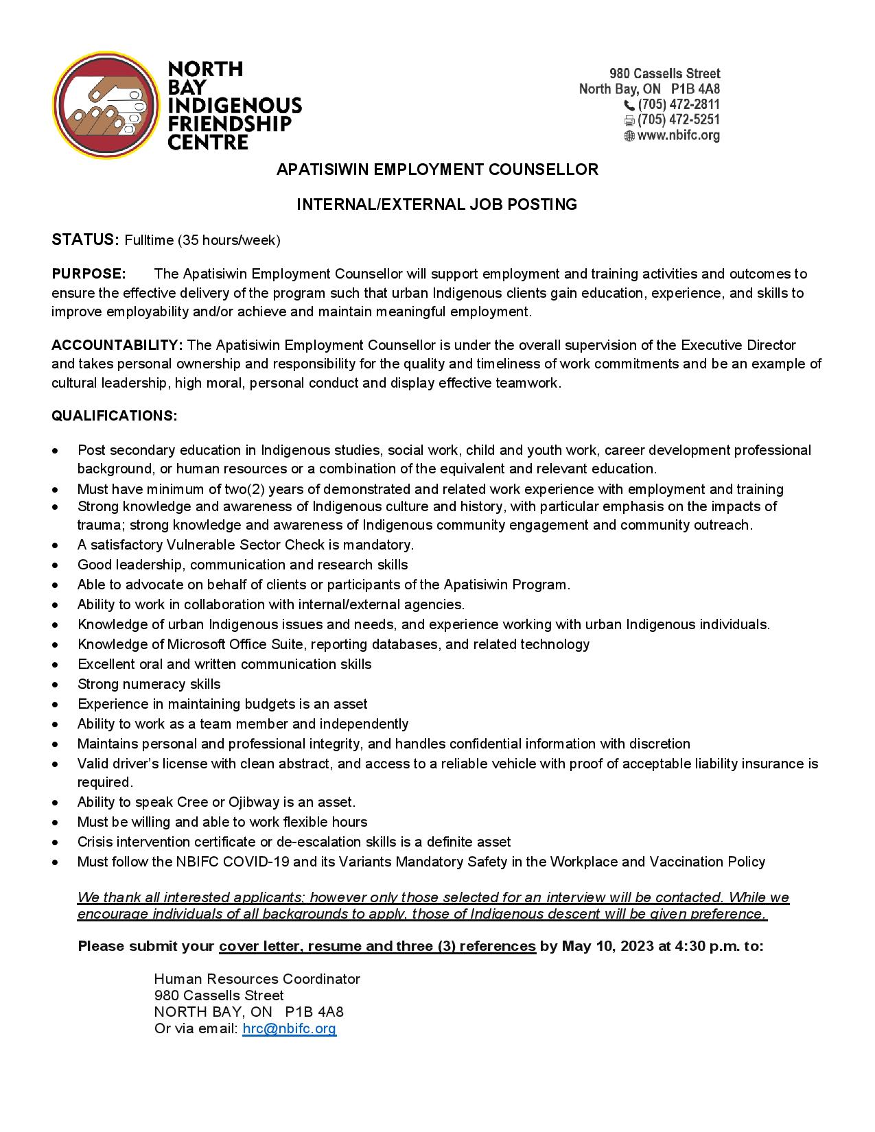 Apatisiwin Employment Counsellor Job Posting dated April 26, 2023-page 1 of 1
